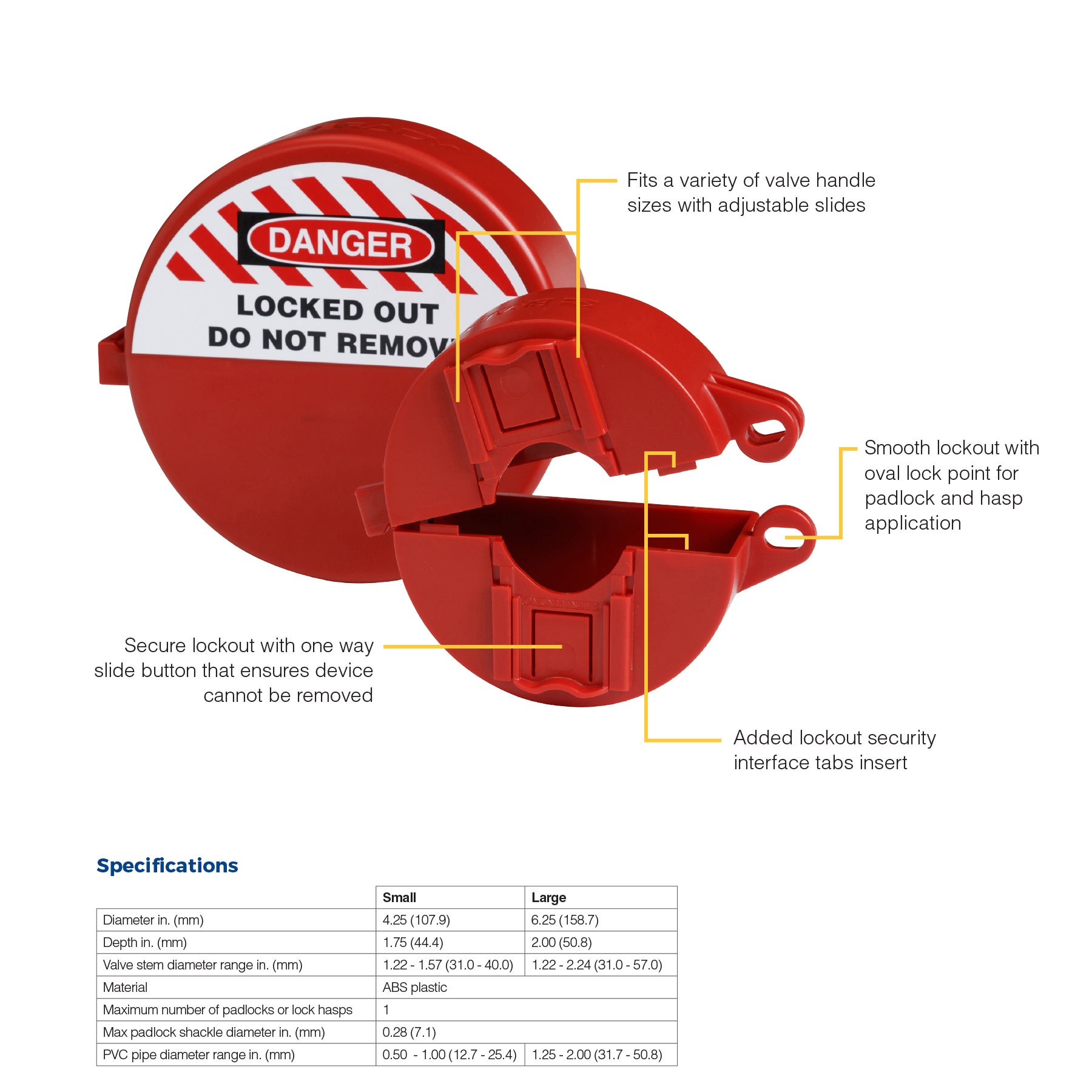 Make sure you isolate hazardous energy, like electricity and water, the safe way with Brady’s T-handle Ball Valve Lockout. Unlike other devices, it has an exclusive, adjustable design that provides a secure fit when locking out T-handle ball valves on PVC pipes. This lockout device is easy to apply, lock and store, and is a safer alternative to using ill-fitting gate valves and cable lockouts, or using tagout alone. And, easy installation means you can move on to equipment maintenance sooner knowing you’re keeping everyone safe.