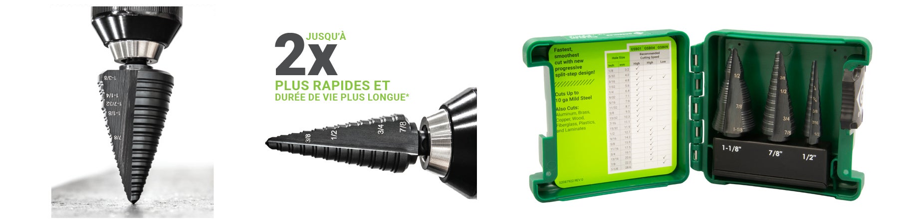 Les nouvelles fraises étagées série GSB de Greenlee assurent la coupe la plus rapide et la plus lisse, ainsi que la durée de vie la plus longue des outils. Un embout fendu durable permet une pénétration rapide et précise du matériau. La conception progressive étagée brevetée optimise l’efficacité du couple afin de minimiser le calage et optimise la charge de copeaux pour une coupe rapide et régulière et plus de trous par charge. La conception à double cannelure poinçon Greenlee standard du secteur a été améliorée pour permettre une meilleure évacuation des copeaux, des vitesses de coupe et une durée de vie d’outil supérieures.
