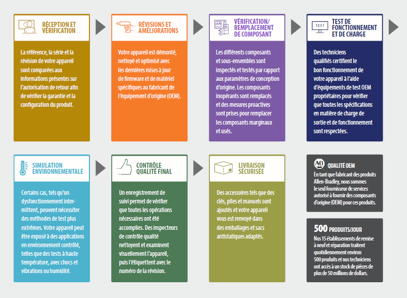 + Les enquêtes menées auprès des clients de Rockwell Automation ont montré que les produits Allen-Bradley réparés par d’autres sociétés peuvent entraîner des taux de défaillance trois fois supérieurs comparativement aux produits réparés par Rockwell Automation.