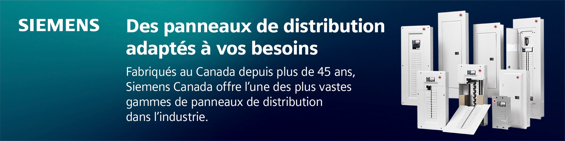 Siemens Canada propose une vaste gamme de panneaux de distribution de la plus haute qualité. Nos panneaux de distribution sont conçus pour le marché canadien avec une sélection exhaustive de disjoncteurs et d'accessoires qui les complètent. De notre conception intérieure brevetée à notre large gamme d'options, ces panneaux de distribution correspondent parfaitement à vos besoins. Un panneau de distribution distribue, protège et contrôle les circuits d’éclairage et d’alimentation en milieu résidentiel et commercial léger.